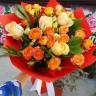 Букет из кремовых и оранжевых роз напоминает осень и понравится всем любителям данных цветовых оттенков.